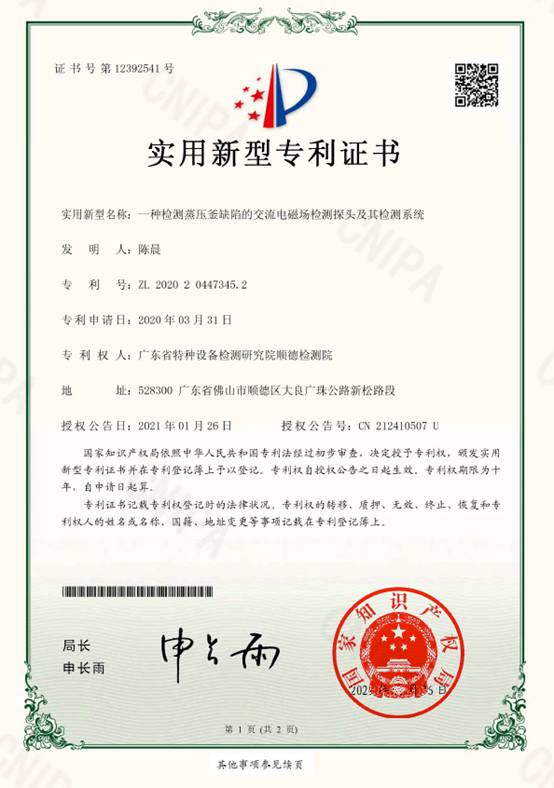 近日,廣東省特種設(shè)備檢測研究院順德檢測院兩項實用新型專利《一種低氮節(jié)能燃?xì)忮仩t》和《一種檢測蒸壓釜缺陷的交流電磁場檢測探頭及其檢測系統(tǒng)》獲得知識產(chǎn)權(quán)局授權(quán)。